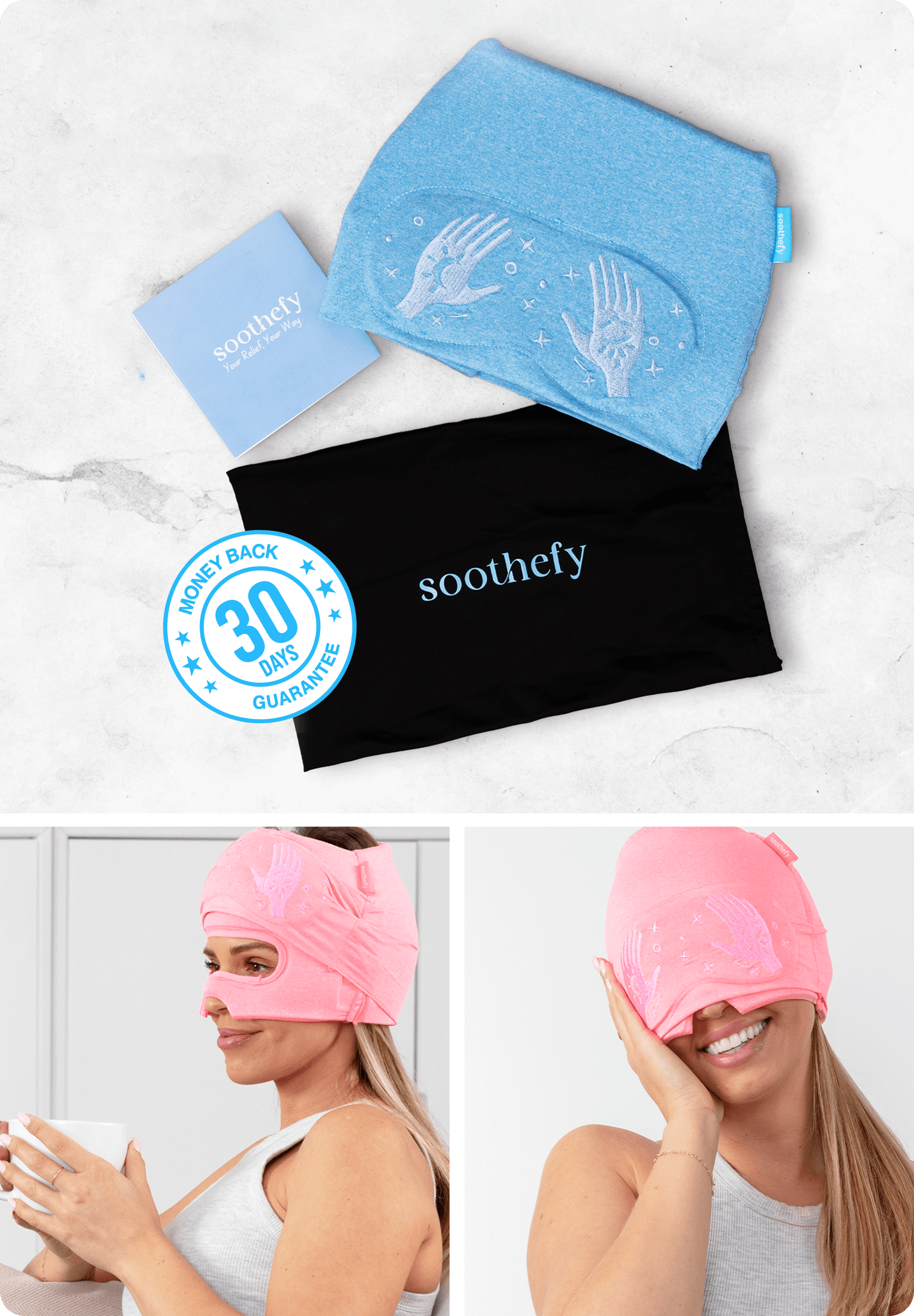 Soothefy is designed for the full spectrum of head pain - from tension headaches to severe neurological migraines. The 360° coverage and dual therapy options (hot/cold) address multiple pain mechanisms simultaneously.